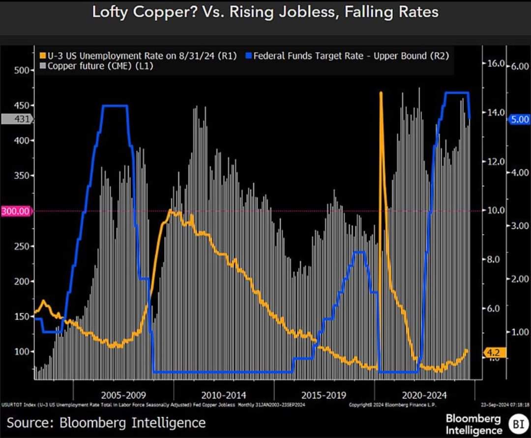 سجل النحاس ارتفاعات جديدة في عامي 2022 و2024 ولم يحقق النفط الخام ذلك، وهو ما يُظهر القوة النسبية للنحاس، ولكن ارتفاع معدلات البطالة في الولايات المتحدة وانخفاض أسعار الفائدة عادة ما يكونان بمثابة رياح معاكسة للمعدن.