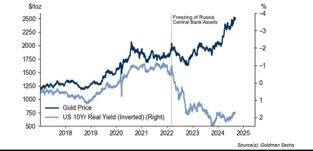 #الذهب يتصدر العالم 🌎 بدأ العائد الحقيقي للذهب وعائد السندات الأميركية لأجل 10 سنوات في عام 2022، عندما تم تجميد أصول البنك المركزي الروسي. منذ ذلك التاريخ، قامت بعض أكبر البنوك المركزية في العالم بالتخلص من سندات الخزانة الأمريكية أثناء تجميع الذهب.