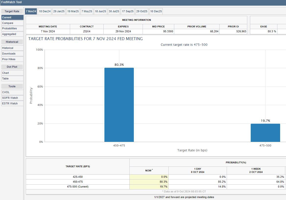 ارتفعت احتمالات عدم خفض أسعار الفائدة الفيدرالية في نوفمبر إلى 20%، مقارنة بـ 0% الأسبوع الماضي ، ايجابي للدولار والاسهم وسلبي للذهب والفضة