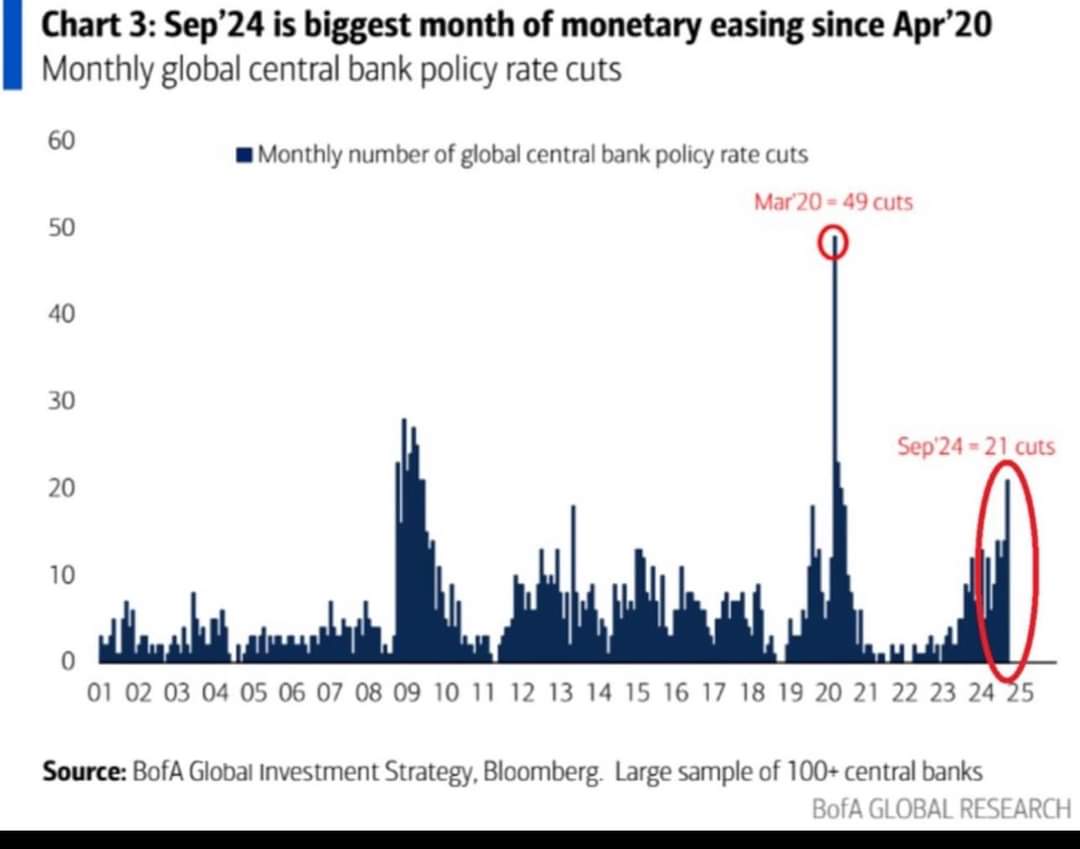 وفقًا لبنك أوف أمريكا، أجرت البنوك المركزية العالمية 21 تخفيضًا لأسعار الفائدة في سبتمبر، وهو أكبر عدد منذ أبريل 2020. وبعيدًا عن الاستجابة للوباء، يعد هذا ثالث أكبر شهر من التيسير النقدي منذ عام 2008. ويأتي كل هذا في الوقت الذي تعتقد فيه البنوك المرك