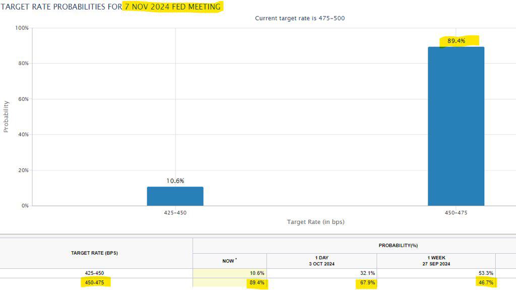 تحرك كبير في العقود الآجلة لأموال الاحتياطي الفيدرالي بعد تقرير الوظائف القوي. تقول السوق الآن أن هناك احتمالًا بنسبة 90% بأن يقوم بنك الاحتياطي الفيدرالي بتخفيض أسعار الفائدة بمقدار 25 نقطة أساس فقط في نوفمبر. وقبل أسبوع، كان السوق يسعر خفضًا آخر بمقدار